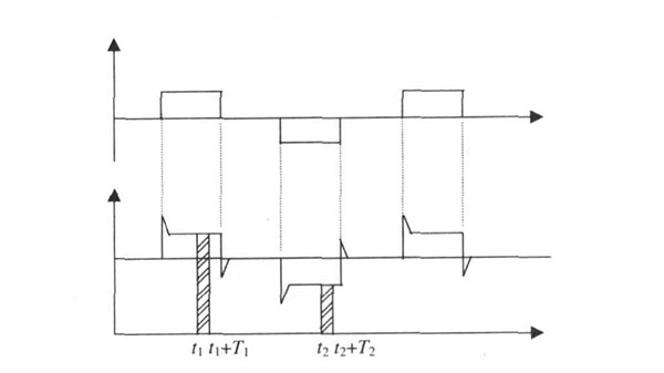 景觀給水流量計(jì)一般都采用工頻交流電源供電, 其電源電壓的幅值和頻率的變化都會(huì)給景觀給水流量計(jì)帶來電源性干擾噪聲。對(duì)電源電壓的幅值變化, 因采用多級(jí)集成穩(wěn)壓, 一般而言電源電壓的幅值變化對(duì)電磁流量的測(cè)量精度影響不大。當(dāng)電源電壓的頻率波動(dòng)時(shí), 雖然其波動(dòng)范圍有限, 但對(duì)景觀給水流量計(jì)測(cè)量精度影響較大。為了解決工頻干擾問題, 實(shí)現(xiàn)對(duì)流體流速感應(yīng)電勢(shì)eab信號(hào)的準(zhǔn)確測(cè)量, 需利用以下基本關(guān)系:①勵(lì)磁周期為工頻周期的整數(shù)倍, 即勵(lì)磁頻率為50/nHz(n為偶數(shù));②正負(fù)勵(lì)磁下的同相位采樣。圖2是對(duì)應(yīng)低頻矩形波勵(lì)磁形式下的典型電勢(shì)信號(hào)形式, 按上述關(guān)系在一個(gè)勵(lì)磁周期下, 若假設(shè)t1 和t2 點(diǎn)為工頻干擾的等效干擾點(diǎn), 且采樣寬度T=T1 =T2 , 則eab的基本算式為: