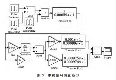 本文基于 Matlab 中 Siumlink 對電極信號進行仿真,勵磁方式為三值波勵磁,勵磁頻率 f=25Hz,傳感器參數 D=40mm、Rx=88.8Ω、Lx=162mH,勵磁系統參數 Ue=100V、穩態電流 I0=200mA。基于電極測量回路搭建的仿真模型如圖 2 所示,圖中信號模塊 pulsGenerator 通過加法器、乘法器得到勵磁電流。由公式(1),在固定流速下感應電勢與勵磁電流成正比,通過增加 Gain1 模塊得到感應電勢信號。 對勵磁電流進行求導即經模塊 Derivative 得到微分噪聲, 其中 Gain 值與 Lx 和 L1 相關。 感應電勢與噪聲經Add1 疊加之后得到電極信號 E1(t)。 scope 觀察輸出信號波形。仿真波形和真實波形如圖 3 所示。 將傳感器參數代入到勵磁電流穩態調節時間公式中,得電流上升時間為 360μs,測得實際上升時間為 390μs,兩者相差不大,驗證了仿真模型的正確性。