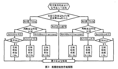 實際生產中流量一直在某個區域內波動,且其動態特性不易掌握。從上面的理論中我們能夠讓誤差△£盡可能的小,這樣距我們所需要的理論值%就越接近。而減小誤差需要我們把n取的盡可能大,也就是在生產時間內劃分更多的周期去調節流量。當工控機根據工業污水印染廢水流量計傳送回來的信號發出調節變頻器工作頻率的指令后,電機調整功率到工業污水印染廢水流量計的實際測量為一個工作周期,我們知道從指令發送到實際測量值返回有一個較大的滯后,如果調節的周期時間小于流量計本身的一個工作周期,那么顯然不可能達到減小誤差的目的。利用模糊控制思想H。,在控制程序中我們把流量的波動區域劃分為±缸×Yo,Yo-t-O.3,Yo±0.5四個區域,其中缸為可調節的誤差范圍,生產中我們取0.015,流量區域劃分的單位均為t/h。針對不同的區域采取不同的調整方案。具體流程如圖3所示。圖中變量Rel表示實際測量的流量,變量Idea表示理論流量。