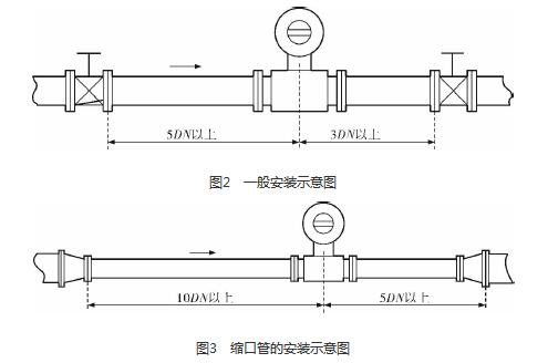 硝酸管道流量計的安裝質量對其測量結果的影響較大,因此在安裝時需要注意幾個問題。*先,硝酸管道流量計直管段的選擇在配管時一定要按照要求進行選擇,一般選擇流量計通徑與工藝管道通徑相同,即可滿足工程需要,而且安裝方便、壓力損失小,流量計直管段上游側的長度不少于5倍工藝管道直徑,下游側的長度不少于3倍工藝管道直徑(圖2)。但在流速太慢而又要求精度較高或需要變徑的應用場合,可選擇通徑小于工藝管道通徑的流量計,以提高測量精度,此時流量計上、下游必須加裝異徑管,且進口異徑管上游側應有長于10倍工藝管道直徑的直管段,下游側應有長于5倍工藝管道直徑的直管段(圖3)。