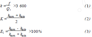 將過熱蒸汽流量計在標準水裝置上,分別用頻譜分析和脈沖計數(shù)的方法進行標定,流體介質(zhì)為水未加氣體,采用的標準傳感器為精度等級為0.2級的電磁流量計。在每個流量測量點上的儀表系數(shù)用公式(1)計算,然后用式(2)計算得到*終儀表系數(shù)K。Ql為被測水的流量值,f為每一個流量點得到的頻率,k為每個測量點得到的儀表系數(shù)。kmax、kmin分別為試驗流量范圍內(nèi)得到的*大與*小的儀表系數(shù)。儀表系數(shù)的線性度E1用式(3)來計算。