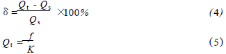 將乙烯流量計(jì)在標(biāo)準(zhǔn)水裝置上,分別用頻譜分析和脈沖計(jì)數(shù)的方法進(jìn)行標(biāo)定,流體介質(zhì)為水未加氣體,采用的標(biāo)準(zhǔn)傳感器為精度等級(jí)為0.2級(jí)的電磁流量計(jì)。在每個(gè)流量測(cè)量點(diǎn)上的儀表系數(shù)用公式(1)計(jì)算,然后用式(2)計(jì)算得到*終儀表系數(shù)K。Ql為被測(cè)水的流量值,f為每一個(gè)流量點(diǎn)得到的頻率,k為每個(gè)測(cè)量點(diǎn)得到的儀表系數(shù)。kmax、kmin分別為試驗(yàn)流量范圍內(nèi)得到的*大與*小的儀表系數(shù)。儀表系數(shù)的線性度E1用式(3)來計(jì)算。