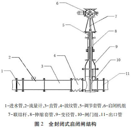 包括進水管、直管、出水管、過熱蒸汽流量計組和啟閉機組,進水管、直管、出水管從左到右依次連接,過熱蒸汽流量計組安裝在直管和出水管之間且位于出水管的入口處,過熱蒸汽流量計組通過聯結桿與啟閉機組的輸出端連接。為防止泥沙淤積影響啟閉,過熱蒸汽流量計采用閘板式啟閉結構。密封式啟閉閘為整體封閉管道式,全部采用不銹鋼材料,水流通過管道流出讓整個閘井內干燥無水。伸縮套管與波紋管的設計讓檢修與清理淤泥更加方便。過熱蒸汽流量計裝有荷載限制器,其布置受力明確、結構緊湊、動作可靠。當吊具上的荷載達到額定值的 110%時,或電機電流超過額定電流 150%時,系統自動切斷操作電源以保護設備安全。