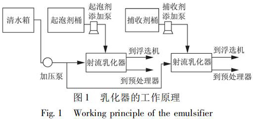 選煤廠浮選藥劑乳化裝置是將藥劑和水制成乳化液,實(shí)現(xiàn)藥劑的合理使用,將對浮選效果和節(jié)約藥劑起到一定的作用。在使用中可根據(jù)藥劑和水的配制比例觀察藥劑的乳化效果,通過乳化器操作箱內(nèi)的的電位器調(diào)整水泵轉(zhuǎn)速,即調(diào)整乳化壓力。自動加藥控制是根據(jù)入浮流量與入浮濃度的檢測結(jié)果,控制起泡劑與捕收劑的加入。乳化器的工作原理如圖 1 所示。