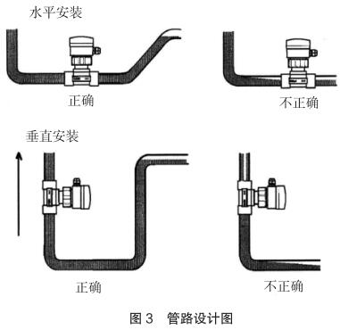 現場安裝時應注意遠離可能對其產生干擾的大型設備,防止長期的熱輻射和其他如磁場直射等環境影響。為確保高測量精度和較好的零點穩定性,進行校正前,高壓電磁流量計應裝入工藝介質中至少 24 小時電極鈍化。安裝的管路設計應確保管道始終充滿流體,防止測量誤差,管路設計圖見圖 3。