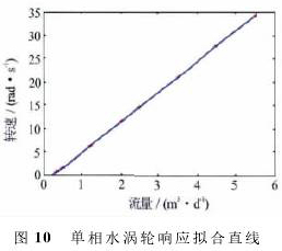 為了驗證切向渦輪在單相流體中的響應情況,在全集流條件下對其在單相水及單相油介質中響應規律進行了研究。對于單相水的渦輪響應情況,進行了在0~6m3/d流速范圍內的渦輪響應實驗,測得單相水介質中渦輪的啟動排量為0.081m3/d,渦輪響應情況見圖10。經過擬合后的響應關系為ω=6.49Q-1.446。