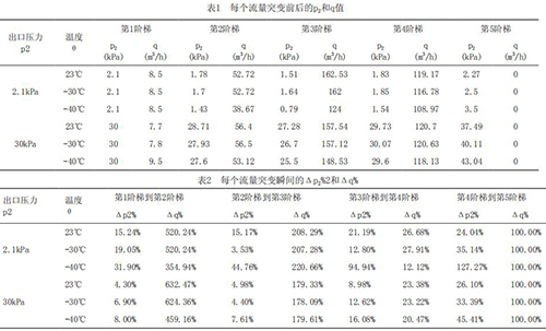 為了深入研究溫度及流量突變對分體式電磁流量計響應速度的影響趨勢,把每個流量突變點前后的出口壓力p2,流量q列表如表1所示。