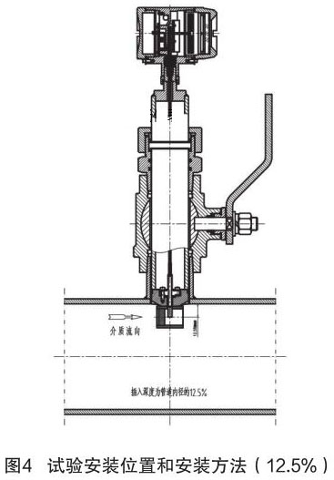 根據(jù)中華人民共和國機(jī)械行業(yè)標(biāo)準(zhǔn):JB/T9249-2015《流量計(jì)》進(jìn)行煙氣流量計(jì)的研制與設(shè)計(jì)。在試驗(yàn)過程中,因?yàn)槔碚撗芯坎怀浞郑偌由辖?jīng)驗(yàn)不足,采用插入深度是按照以往其它產(chǎn)品(插入式電磁流量計(jì))的經(jīng)驗(yàn),以插入深度為現(xiàn)場管道內(nèi)徑的 12.5% 進(jìn)行試驗(yàn),其對(duì)介質(zhì)流量的檢測值與同種規(guī)格管道法蘭式結(jié)構(gòu)的流量計(jì)進(jìn)行比較,偏差值較大、儀表準(zhǔn)確度無法滿足設(shè)計(jì)要求。試驗(yàn)安裝位置和安裝方法如圖 4 所示。