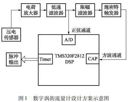 本文設計的基于 TMS320F2812 DSP 的數字鍋爐煙氣流量計的信號處理系統由前置放大電路和數字信號處理電路兩部分組成。本文選用的前置放大電路即為目前被廣泛應用的普通流量計的前置放大電路,主要由電荷放大電路、低通濾波電路、限幅濾波電路和施密特觸發電路組成; 對于經壓電傳感器測得的渦街信號采用了頻域分析和時域分析相結合的方式,即由前置放大電路和數字信號處理電路相配合。時域分析通道利用 DSP 事件管理器的捕獲模塊,對前置放大電路輸出的方波進行頻率計算,然后再由 DSP 事件管理器通用定時器的比較輸出模塊進行脈沖輸出。頻域分析通道即 DSP對低通濾波電路輸出的疊加了許多噪聲的正弦信號進行 A/D 采樣,再利用 DSP 對 A/D 采樣的結果進行頻譜分析,從而得出此時渦街信號的頻率,*后由 DSP 通用定時器的比較輸出模塊進行脈沖輸出。系統設計方案示意圖如圖 1 所示。