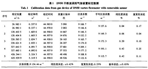 由表1和表2的實際標定數據可知,在量程比大于1:10的情況下,用不斷流管道煤氣流量計測量氣體或液體介質時,基本誤差及重復性均能達到中華人民共和國機械行業標準JB/T9249一1999《渦街流量傳感器》[’1中所規定的精度要求。