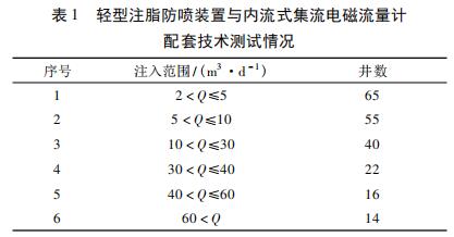 在實際應用中,使用輕型注脂防噴裝置與內(nèi)流式集流智能型渦輪流量計配套技術(shù)對喇叭口在射孔層上注聚井進行測試。輕型注脂防噴裝置與內(nèi)流式集流智能型渦輪流量計配套技術(shù)施工工藝參見文獻,測試情況見表 1 所示,低注入量井( ≤10 m3 /d) 占到 56. 60% 。