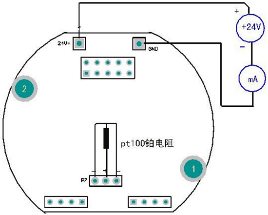 2. +24V、0V 為電路板供電和信號(hào)輸出端,兩線制儀表的電流為信號(hào)輸出,供電和測(cè)試,取信號(hào)如圖所示。