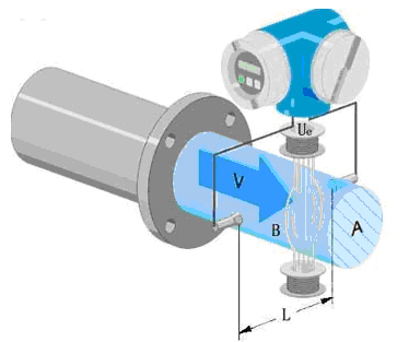 污水流量表工作原理是基于法拉*電磁感應(yīng)定律。流量計(jì)的測(cè)量管是一內(nèi)襯絕緣材料的非導(dǎo)磁合金短管。兩只電極延管徑方向穿通管壁固定在測(cè)量管上。其電極頭與襯里內(nèi)表面基本齊平。勵(lì)磁線圈由雙向方波脈沖勵(lì)磁時(shí),將在與測(cè)量管軸線垂直的方向上產(chǎn)生一磁通量密度為 B 的工作磁場(chǎng)。此時(shí),如果具有一定電導(dǎo)率的流體流經(jīng)測(cè)量管,將切割磁力線感應(yīng)出電動(dòng)勢(shì) E 。電動(dòng)勢(shì) E 正比于磁通量密度 B ,測(cè)量管內(nèi)徑 d 與平均流速 v 的乘積。電動(dòng)勢(shì) E (流量信號(hào))由電極檢出并通過電纜送至轉(zhuǎn)換器。轉(zhuǎn)換器將流量信號(hào)放大處理后,可顯示流體流量,并能輸出脈沖,模擬電流等信號(hào),用于流量的控制和調(diào)節(jié)。