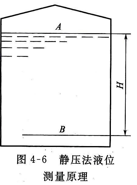 由式(4—8)和式(4—9)可知,液體任何一點的壓力等于其表面壓力加上液體密度與重力加速度及液柱高度的乘積。液體的靜壓力是液位高度和液體密度的函數,當液體的密度為常數時,A、B圖4—6靜壓法液位測量原理兩點的壓力或壓差僅與液位高度有關。因此可以通過測量P或Ap來實現液位高度的測量。這樣液位高度的測量就變為液體的靜壓測量,凡是能夠測量壓力或壓差的儀表,只要量程合適均可用于液位測量。